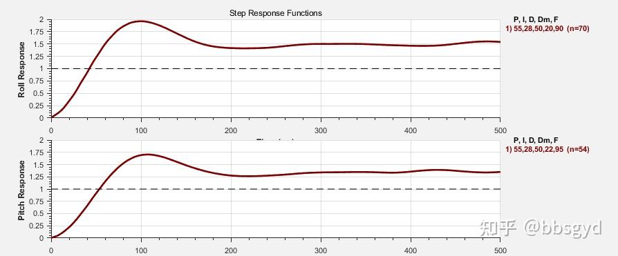 4.不同机型PID曲线对比:以下两个图是F450机架和5寸花飞机架跃阶时间曲线对比。通常5寸飞机的PID设置基本符合时,在30ms时到达最高点,在40ms时回调到目标姿态1,在60ms时再次超调,80ms时基本回调,完成目标姿态1的锁定。