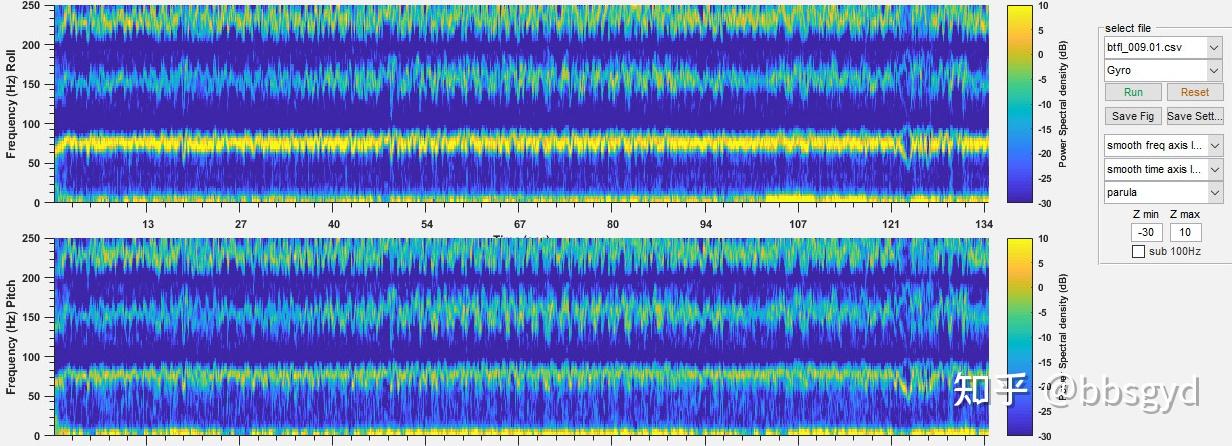 上图中出现的严重振动噪声分布在75Hz、150Hz、230Hz附近,可以看出这台飞机使用了容易产生振动的机架或者桨叶,如果不使用滤波压制这些振动,飞机很容易出现电机热、姿态失锁难于操控、振动失去升力、失控等问题。
