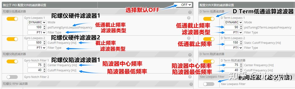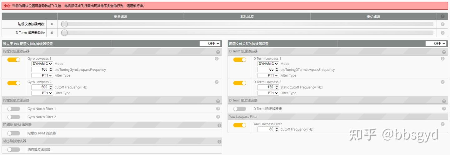 *陀螺仪硬件滤波和D Term是必须要开启和设置的,否则飞机没法升空飞行。