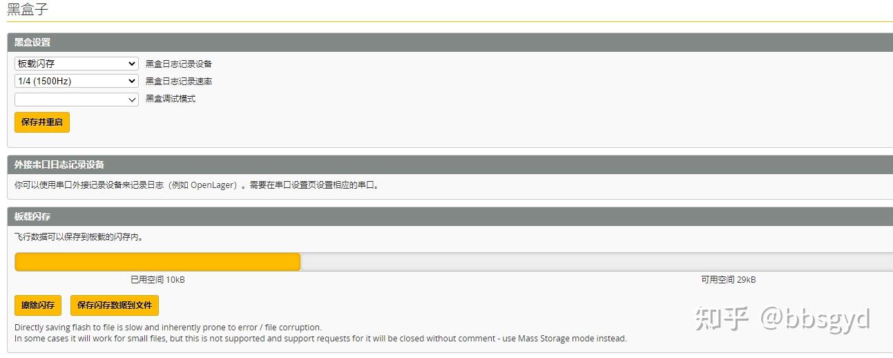 *设置黑匣子(飞行日志记录仪),飞机硬件装好后,使用BF调参软件对飞行日志记录器进行设置,将采样设为500-1.5K,并擦除存储器(格式化闪存)。飞机上电后解锁电机,记录器就会将陀螺仪采样的数据保存在闪存芯片里,飞完下来通过USB数据线连接飞控,可以读出记录文件用于调参分析。