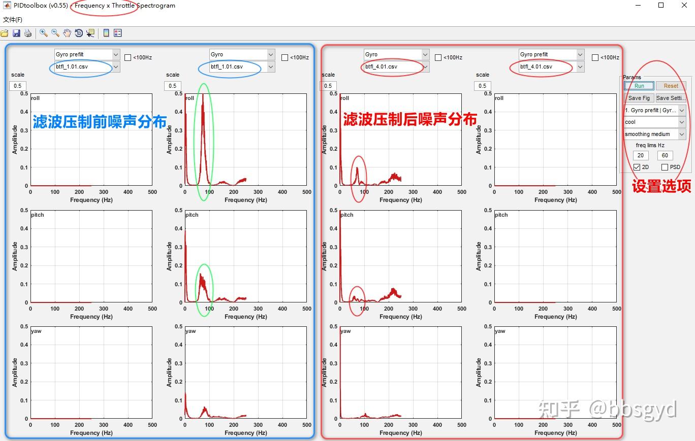 5.噪声分布:使用PIDtoolbox工具也可以查看到噪声频率分布,在首页面点击Freq X Throttle或者Freq x Time按钮进入噪声频率分析工具界面中,选取需要分析的项目,点击Run开始计算。通过观察噪声频谱分布范围和噪声大小值,确定需要进行衰减和压制的噪声频率区间,再到BF调参软件中,设置滤波器的低通截止频率和陷波器的参数。下图为滤波前与滤波后的两个日志文件分析对比,左边为滤波设置前。