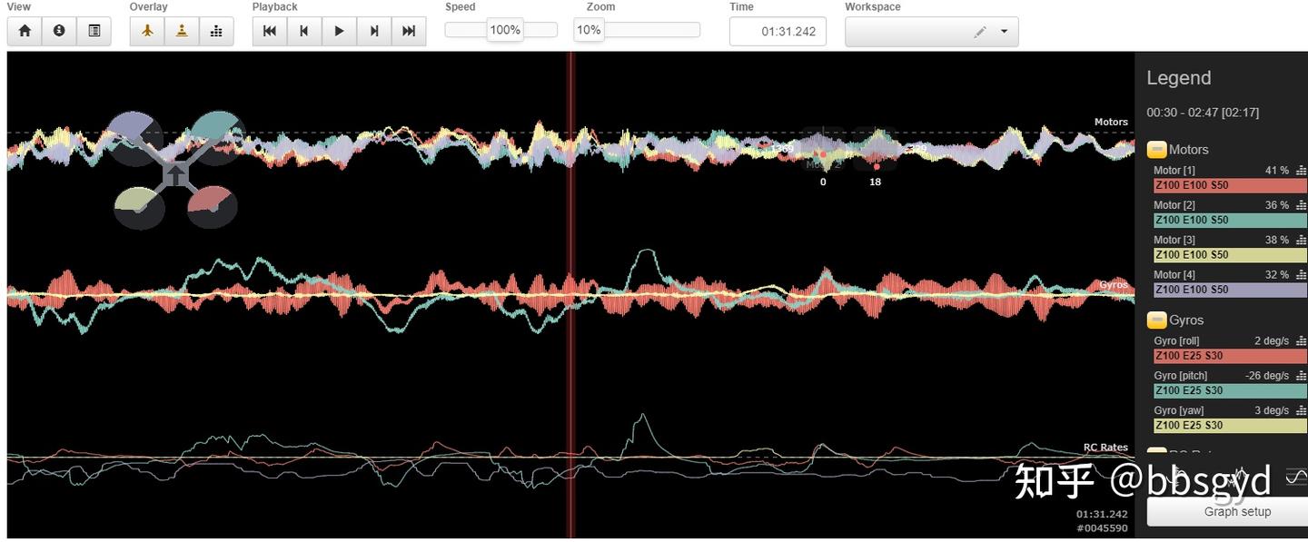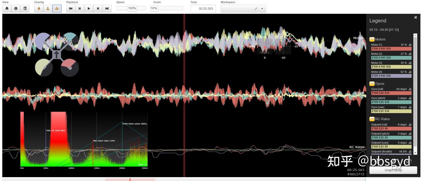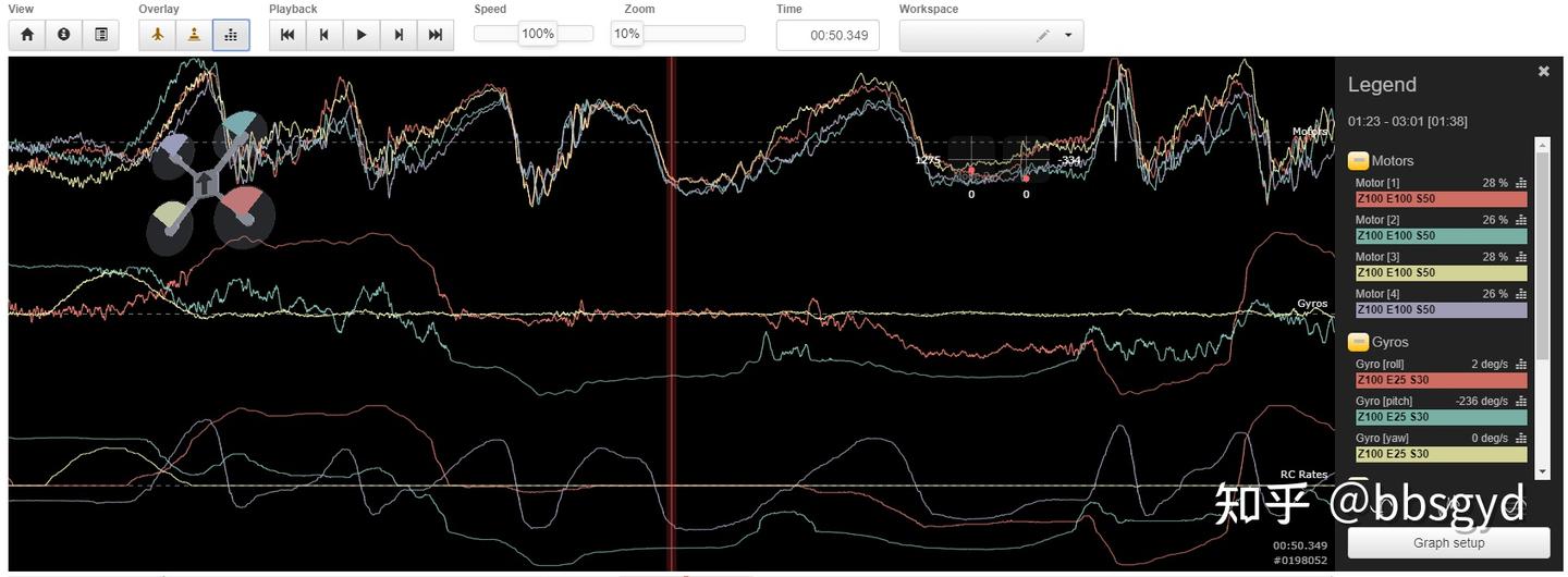 如果在查看日志文件(黑匣子数据)时,缩小或者放大时间比例,看到小波纹多,说明PID参数距离理想值较大,需要适当修改PID值。当然,通常PID参数的调整,大多需要使用PIDtoolbox工具来协助分析的。