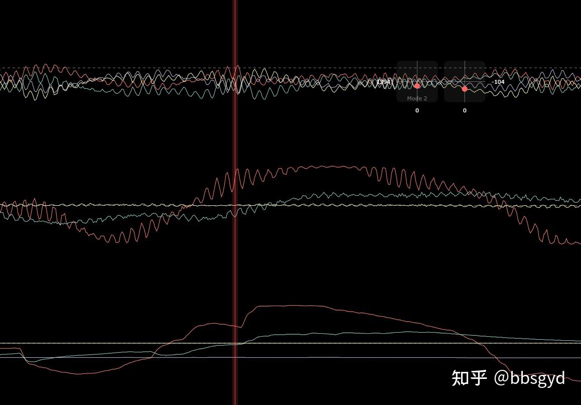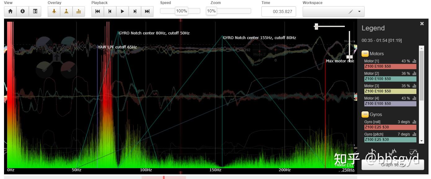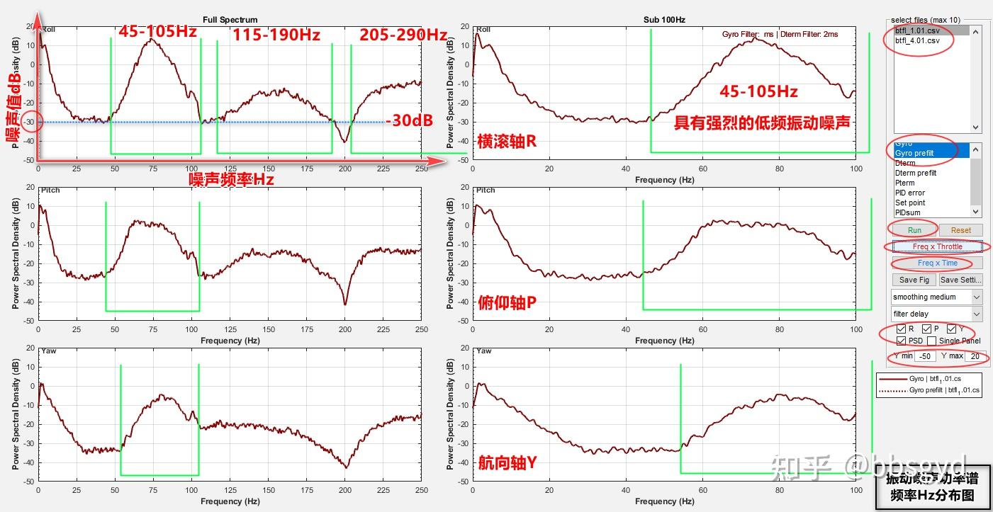那么,这两个明显噪声就会被进行压制过滤。不用担心会滤掉有用的信号,毕竟滤波器的过滤强度是从边缘向中心逐渐变化的,频带不设置宽一些,边缘噪声是过滤不掉的。上图中使用PT1滤波的50-110Hz振动噪声没有被完全滤除,可以将截止频率再设置得低一些,如35Hz,争取能将这个严重的振动噪声都过滤掉。多个滤波器设置时,位于重复滤波区域的噪声频率会被叠加过滤。