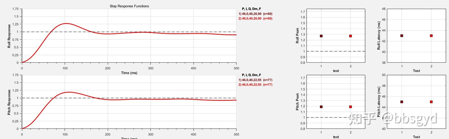 第一次试飞R/P轴的PID为55.28.50,第二次试飞R/P轴的PID为46.0.40,可以看到前一张图的跃阶时间曲线大大高于1,第二张图的曲线基本能靠近1,可以比较出两组PID参数中,第二次试飞的PID数值更适合这台飞机。