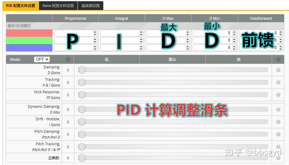 通过拖动滑条,改变控制参数,自动生成PID值,大多数飞机可通过这种方法预置PID控制参数,许多新入坑的新同学也是用这种方法来设置飞机的PID参数。