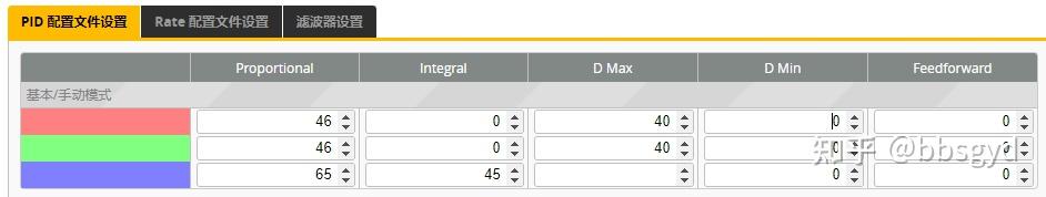 *设置飞行参数(基本参数),使用BF调参软件对飞控的基本飞行参数进行设置,这里主要是依照机架和动力配置预置一组PID,这里我们要设置几组参数,飞机横滚轴Roll PID为46.0.40、俯仰轴Pitch PID为46.0.40、航轴的Yaw PID PID为65.45.0,也可以将D Min(最小D值)都设为30。航向轴YAW的D Max和D Min都为0,以后的测试参数设置时YAW的参数都可以不用改,如果出现转动方向振动现象可以适当减小YAW的P、I值。