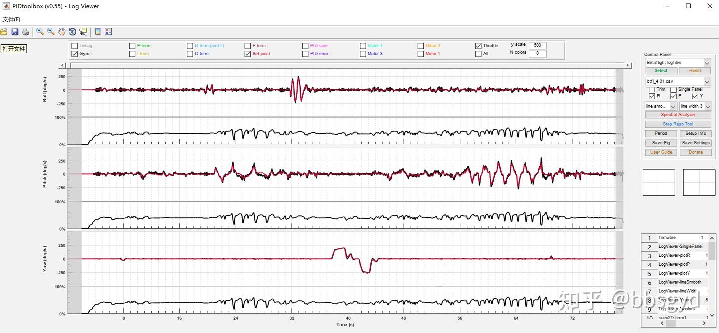 进入软件界面后点击select按钮,选取前面保存的飞行日志文件,如*.BBL或者*.BFL文件,开始进行计算,完成后看到主界面的陀螺仪、油门大小时间线采样图。勾选最上方的项目复选框,就可以看到对应的采样数据记录曲线。