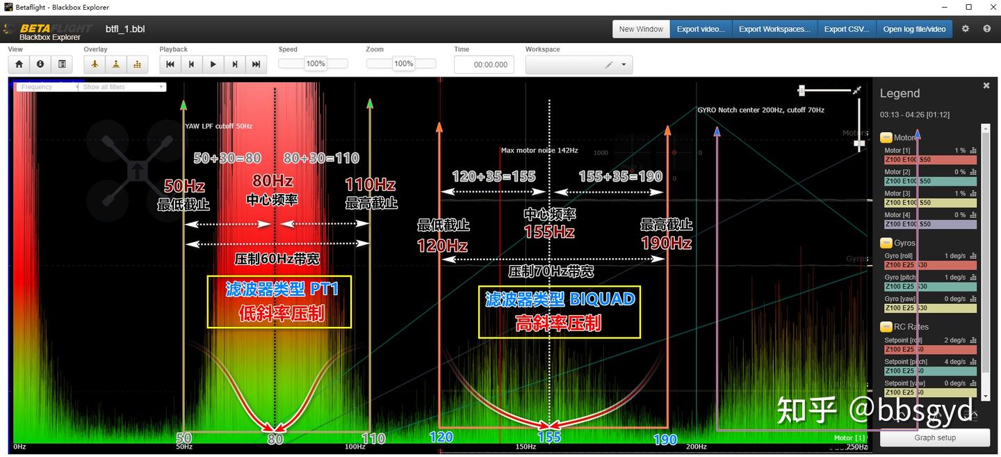 斜率就是两侧向中间过渡的倾斜比例,例如同一个滤波器参数值下,两种不同类型滤波器的边缘压制力度是不一样的,请看Betaflight Blackbox Explorer播放软件中显示的陀螺仪振动噪声分布图。