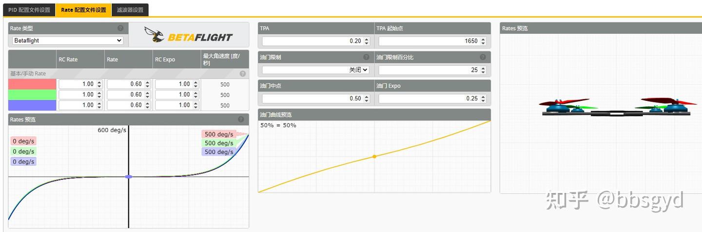 *设置Rate页面中的Rate百分比数值,让飞机的最大角速度等于500度/秒。这参数在试飞时很重要,PID分析软件能更准确计算出500度/秒内的各种数据。
